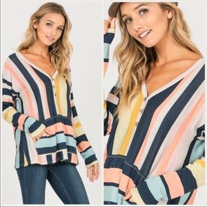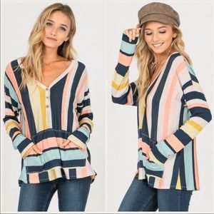 This lite-weight striped Henley is perfect for transitioning from Winter to Spring temperatures. Adorable button accents and front kangaroo style pockets.