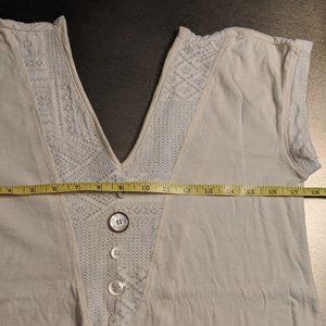 Super sweet top! Fourth & sixth photos show actual garment for sale; buttons on this are different from those on the initial stock photos. Sized like a S/M. Please see measurements shown in photos. Color is a creamy off-white.
