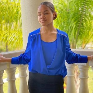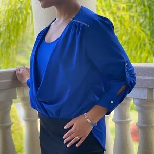 Beautiful royal blue Calvin Klein adjustable long sleeve blouse. Top is size medium, loose fit, & can fit up to size large comfortably. This blouse is lightly worn & in great condition! Blouse material is very lightweight which feels & looks amazing. Perfect for work & meetings throughout the year!!