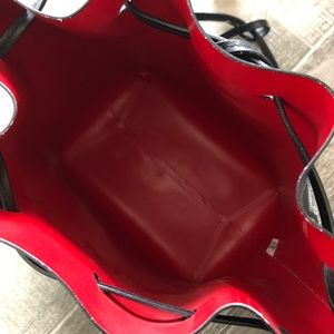 *Will include dust bag when shipping. Original box upon request.* Black vegetable tanned leather bucket bag with red matte patent interior. This is their large size measuring at approximately 12.25” x 10” x 6” and a strap drop of 16”. Adjustable strap. Made in Italy.