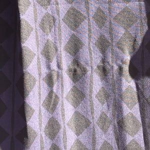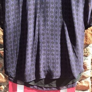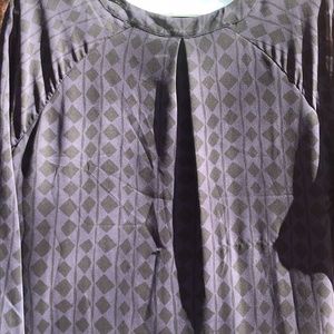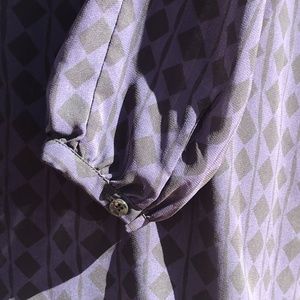 Took more photos today out in the sunlight and noticed a single thread is pulled across the back. See final photo. Marking the price down to compensate for flaw. The dress is beautiful - same dress in photo one. Dark purple with a black geometric print. Sheer sleeves. Pleat at back between the shoulders. Fully lined. Button cuffs. Comfortable, relaxed style.