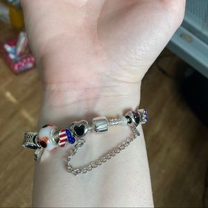 A silver snake style chain and barrel close clasps. Includes 11 charms, 2 of which the safety chain is fastened onto. Beautiful piece with rhinestones and sparkles galore! A perfect gift for any Disney lover! Perfect for summer, 4th of July, Independence Day, etc. features Mickey Mouse, Minnie Mouse, and American flag charms.
