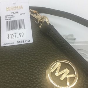 NWT authentic Michael Kors Fulton Top Zip Wristlet Duffle Fabric logo lining with 3 card slots inside; Golden tone hardware; Leather wrist strap 6” drop; 7” x 4” x 1/2”