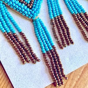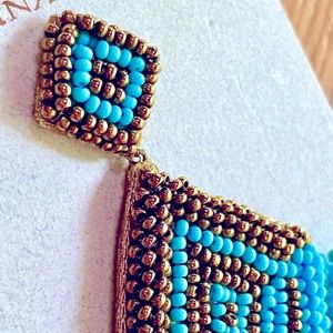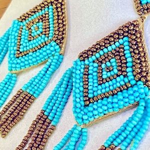 Gorgeous turquoise & bronze beaded diamond-shaped chandeliers with long beaded fringe, by jewelry designer Deepa Gurnani whose work is often featured by Anthropologie. A knockout style with a peasant top vibe, elegant, lightweight & guaranteed to bring raves. Designed by Deepa & handmade according to her specifications by jewelry artisans in India, with delicate glass beads, vegan leather backing & post backs. Approx. 4 1/2” long, 1 3/4” wide. NWT 🌷