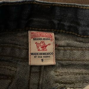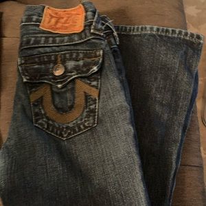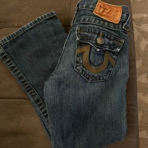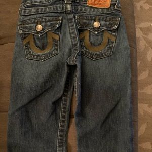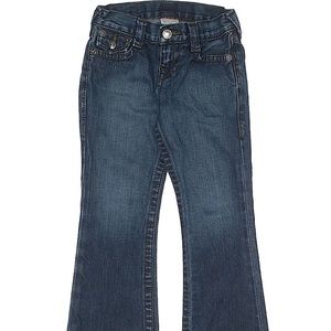 True Religion flap pocket blue jeans. Size 5 = 5T girls. Bootcut with silver hardware and signature stitching on back pockets.