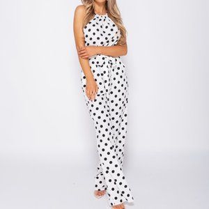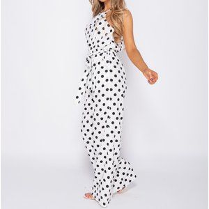 White and black polka dot sleeveless open back wide leg jumpsuit