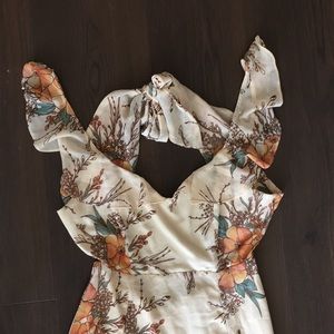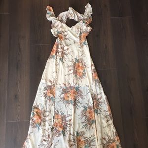 Half lined tropical floral maxi dress, ruffle straps and tie in the middle of the back