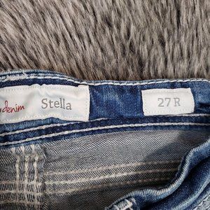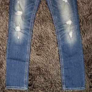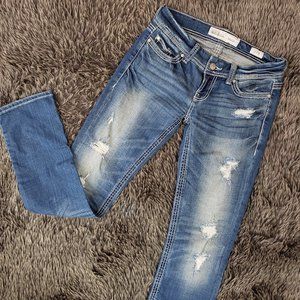 BKE Size 27 Stella straight leg jeans with a low rise and distressing throughout. They're in great condition aside from one very small spot on the right leg. Please see all photos and measurements.