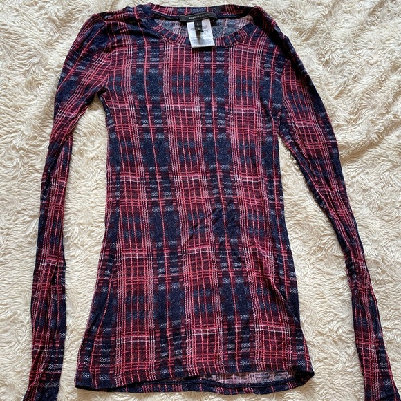 An older BCBG Max Azria top. It’s red plaid modal knit, designed to be skintight on the arms and chest especially, with lots of stretch and partly seethrough when worn. Only worn a few times.