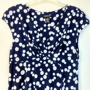 Dark blue dress with white polka dots, in fit-and-flare style with a V-neck. Not sleeveless, but very short sleeves. The skirt length reaches below knees, but above ankles.