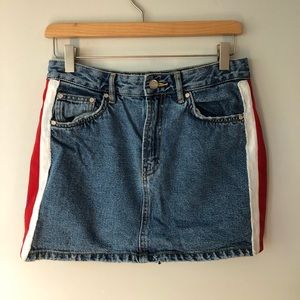 jean skirt with red and white stripe down both sides. no size on tag but definitely fits like a small. not good with the number sizes so i wouldn’t be able to guess well enough, but i wear a size 6/8 in jeans and it’s way to small on me if that helps. im sorry!
