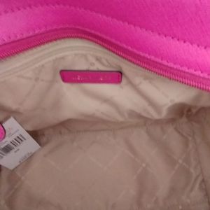 Just in time for spring and summer! Eye catching gorgeous sublte fuschia color accented by gold studs and gold hardware. Shoulder strap included to carry different ways as a shoulder bag, cross body or remove strap to only carry with handles.