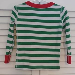 Christmas themed Pajama Top from Hanna Andersson. Green and white striped with red collar.