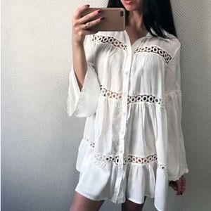 White cotton tunic blouse with button up front and circle design crochet detail. Collar. Wide bell lantern style long sleeves. Can be worn as a blouse or a swim coverup. One size fits most.