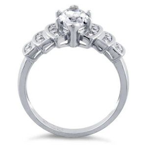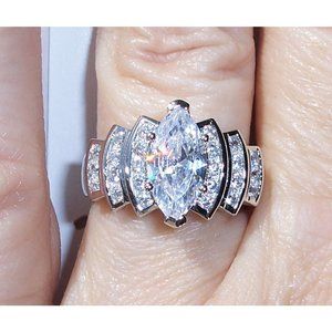 NWOT Sterling Silver Ring. This gorgeous women's fashion ring has a 12x6 (mm), 1.62 carat prong set marquise cut cubic zirconia stone in the center with 3 rows of round cut bezel set CZ stones on each side. This ring is a stair step design, is 12.5 (mm) wide at its widest point, is stamped 925 and has a Rhodium finish for greater shine and durability. If you don't see the size you want please contact me and I will see if I can order one for you, this ring comes in sizes 4-12, no half sizes.