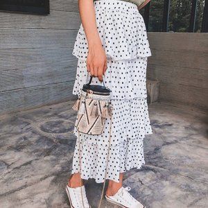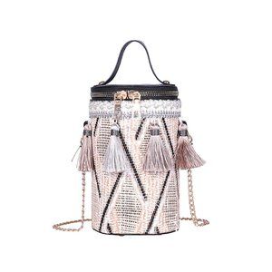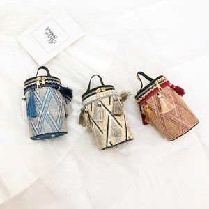 This bucket bag is too cute for words! It comfortably fits any size cell phone, keys, and sunglasses at once (you know, the average few things that you would need for a day out or a festival!) // Zip around closure // carry this bag by its top handle OR by the gold detachable Crossbody adjustable strap // Pictures are true to scale // bag is available in black, red, and blue themed options as shown in additional pics. If interested, just asked to be tagged in the other listings 💋