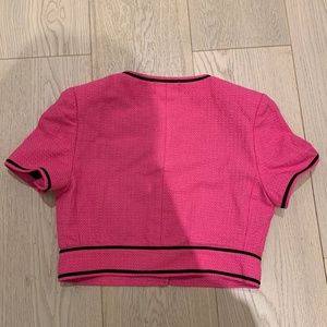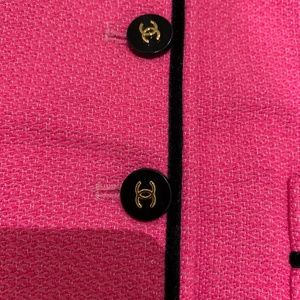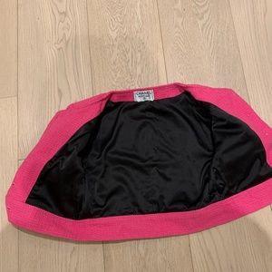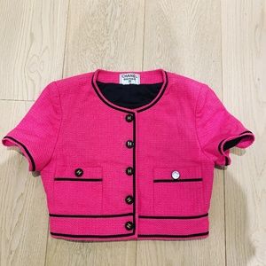 Extremely rare and highly coveted vintage Chanel hot pink short sleeved 90s tweed blazer/jacket. Has velvety trim and signature CC buttons. No size tag however this jacket is pretty tiny, bust measures about 31-32 inches so I would estimate a size 34FR or about 0-2US. Too small for me or I wouldn't be letting it go!! Unicorn find.