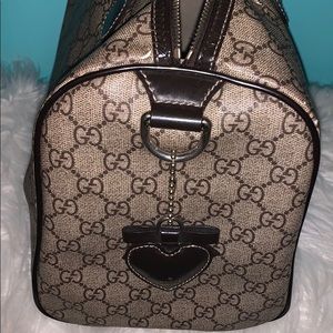 The Gucci Brown GG Coated Canvas Tattoo Heart Medium Joy Boston Bag is big enough for all that we need to carry. This sleek bag features durable GG coated canvas with brown patent leather trim, a tattoo heart Gucci silk-screen and a dangling heart charm for a little added bling.