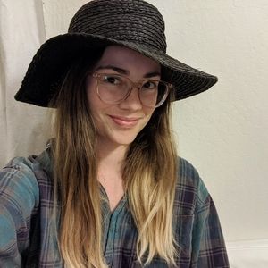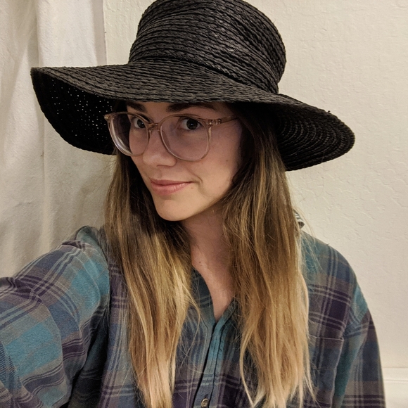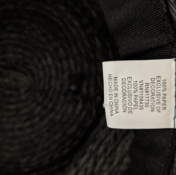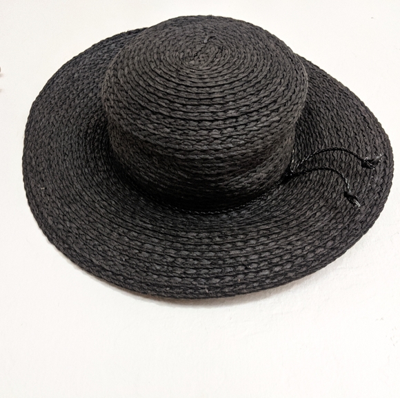 This pretty sun hat features a lightly black washed woven paper, and wide, floppy brim, accented by a thinly braided trim. Excellent pre-owned condition, with some creasing in the crown from storage, see photos for details.