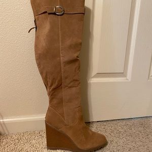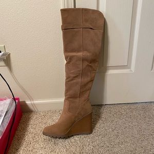 Wedge heeled boots true to size. They are wide-calf. Never worn and still in the box.