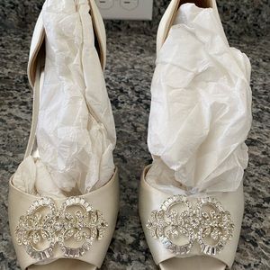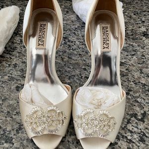 Badgley Mischka Salsa Embellished Peep Toe Pump. Color: vanilla satin. Worn once by my mom for her wedding. Just a few little scuffs.