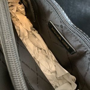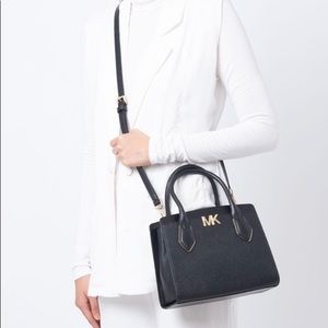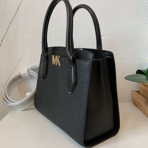 A Michael Kors Montgomery Messenger Bag Leather with gold-tone hardware. This crossbody bag features 2 main pockets, center zip pocket, 2 leather handles with a 4.25 drop; adustable strap with a 18"-20.5" drop. Dimensions: 9.2"W x 7.5"H x 4"D.
