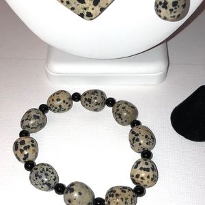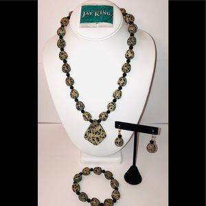 Jay King spotted and black agate necklace, earrings and stretchy bracelet. Necklace is 20-23” with 3” extender. All are in excellent condition, like new.