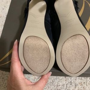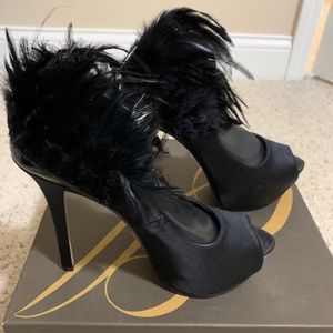Beautiful Black Satin pumps with black feathers that wrap around the ankle.