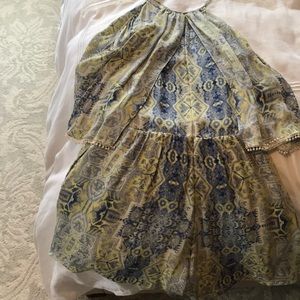Halter style romper with thin straps. Ruffled back with split overlay. Gorgeous material and very fun pattern. Wonderful vacation and summery piece for the wardrobe.