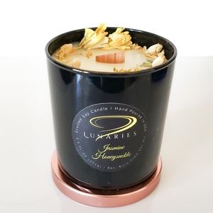 Hand-poured Jasmine Honeysuckle Scented Soy Candles with Wooden Wick and Botanicals.