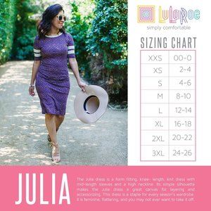 NWT LuLaRoe Julia form fitted dress. Knee length, stretchy, and can be worn long, rolled up, or tied to make shorter. High scoop neck. Mid-length sleeves that reach about to the elbow.