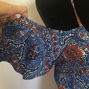 JACK by BB Dakota lined spaghetti strap cold shoulder dress Size XS features a fun blue, rust & white boho print, an elastic waist that expands to 17” with a self tie. Length measurement is 40”-straps are adjustable, and bust measurement is 17”.