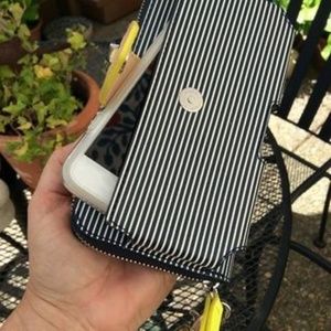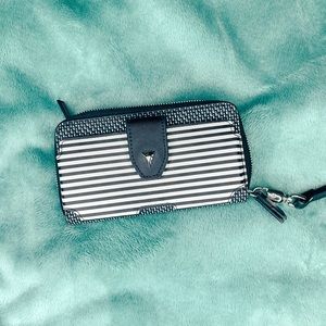 Black/Créme Breton Stripe zip-around wallet with a removable wristlet, coin purse and card slots galore for the girl on the go!