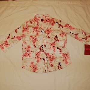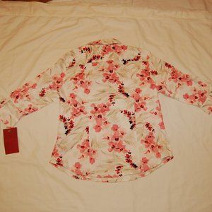 Petite V-Neck Button Up 3/4 Sleeve Blouse. Flowers in shades of pinks and tans with a touch of black. 3/4 sleeves with a 2 button closure. Blouse has a little but of stretch. Approx measurements are as follows: Shoulders 15.75"; Bust 21"; Shirt Length 24" Sleeve Length 16"; Cuff Width 5.25"