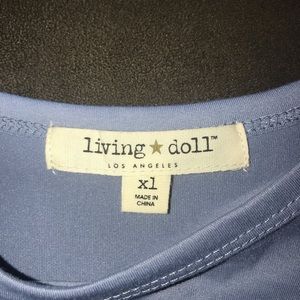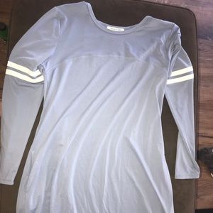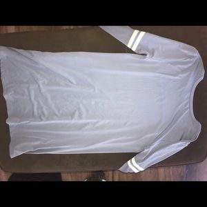 A sky blue dress, with white stripes, comes a little over the knees, and has pockets.