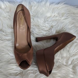 Brown Satin YSL Saint Laurent Peep Toe Heels Sz 40