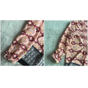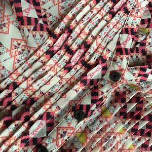 Great used condition. Kaveri Popover Top by Anthropologie brand HD in Paris in white with allover black, yellow, pink and gray detailing. Super cute and perfect to pair with a cardigan or blazer for the office or to wear more casually with denim. Long-sleeve top with optional roll-tab button detail. Smocking at front button placket with v-neckline. Size 2, see photos for measurements.