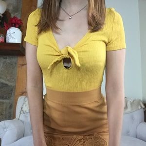 Check out this fabulously feminine crop top! Perfect with denim shorts or colorful skirt. Top features knotted front, deep v neck and short sleeves.