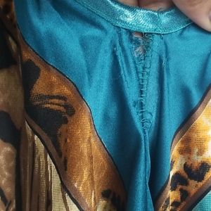 Beautiful Vibrant Colored Dress...Blue Stones At Collar. Has Long String That Ties...Scarf Like Front That Flows With The Asymmetrical Length of The Dress...Just Gorgeous....****See Pics....Dress Has Some Easy Fixable Flaws...SEE PICS. NEVER WORN...Just Tried On and Ripped It. One Stone fell off,but I attached it to the dress😉