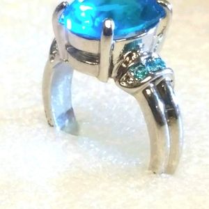 Oval blue topaz in silver. Appox 6.5 carats. Flanked on each side by a small channel of light blue cubics. Will compliment any shade of blue worn. Simple. Nice. Affordable