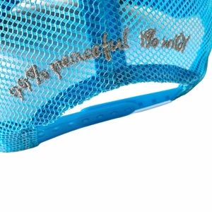 An embroidered logo graces a simple trucker hat with mesh SnapBack. Embroidery logo at front. Embroidered slogan at back “99% peaceful 1% wild” A fun little find