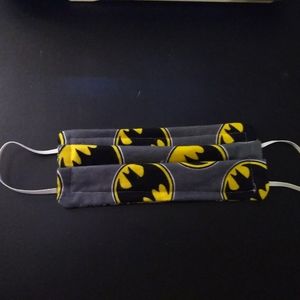 Homemade fabric face mask cotton Batman fabric on the outside and flannel Batman fabric on the inside. Elastic loops over the ears