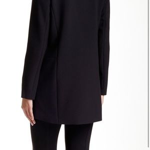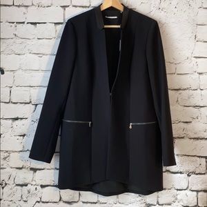 A long line notched collar blazer with edgy side zip features. - Notched collar - Long sleeves - Front hook-and-eye closure - Front zip pockets