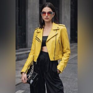Crafted from supple genuine lamb leather, the Mila moto jacket delivers a sleek, modern take on classic biker styling. This fully lined statement piece features wide notched lapels, black metal hardware, and precision tailoring that elevates everyday street style into polished luxury.