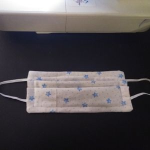 Homemade fabric face mask cotton birdhouse/garden fabric on the outside and flannel white with blue stars fabric on the inside. Elastic loops over the ears