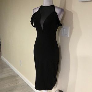 Polyester/spandex blend. Material has a little give. Mesh top with keyhole back bodycon midi. Displayed on standard size 6 mannequin and fits snug. Fits 4-6 well. Size 6 will fit very form fitted. Measurements 34-25-35.