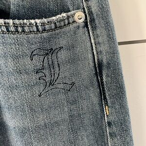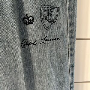 Ralph Lauren Print Wide-Leg Jean. Collegiate Indigo Wash. wide-leg cut and vintage varsity–influenced screen-printed motifs define the retro-inspired style of these right-hand-twill jeans.