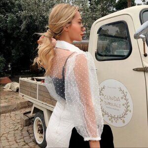 Collared blouse featuring semi-sheer sleeves falling below the elbow, swiss dot detail and a button-up front.