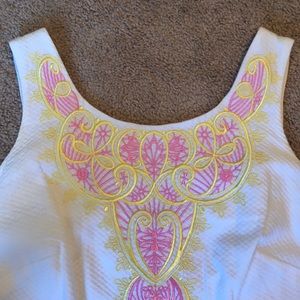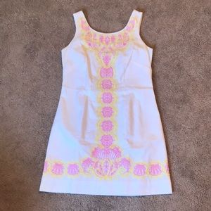 Lily Pulitzer white dress with pink and yellow embroidery. Scoop neck and back. Gold zipper has no issues. Worn once. 100% cotton. Size 6. No damage or flaws. Smoke and pet free home.