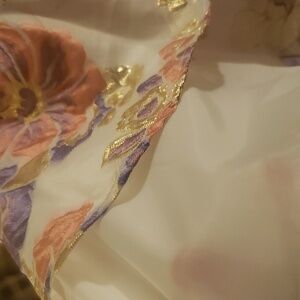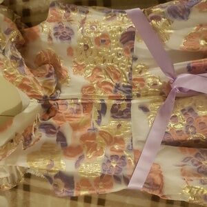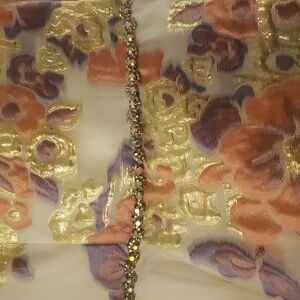 This Cap Sleeve Floral Dress with Rhinestone Waist Embellishment is perfect for a dressy Spring occasion. It's beautiful with an underneath lining that gives the dress the puffiness at the bottom that's giving "Cinderella". The flower print are gold, white, lavender. and peach with a satin lavender ribbon in the back.